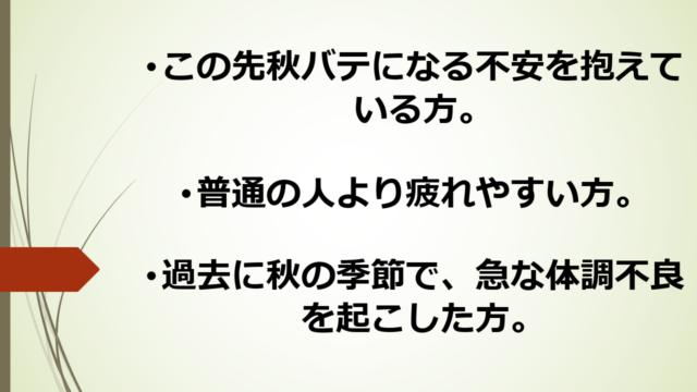言葉を変えれば、熱中症対策と同じ様に、秋バテ対策もすべきです。