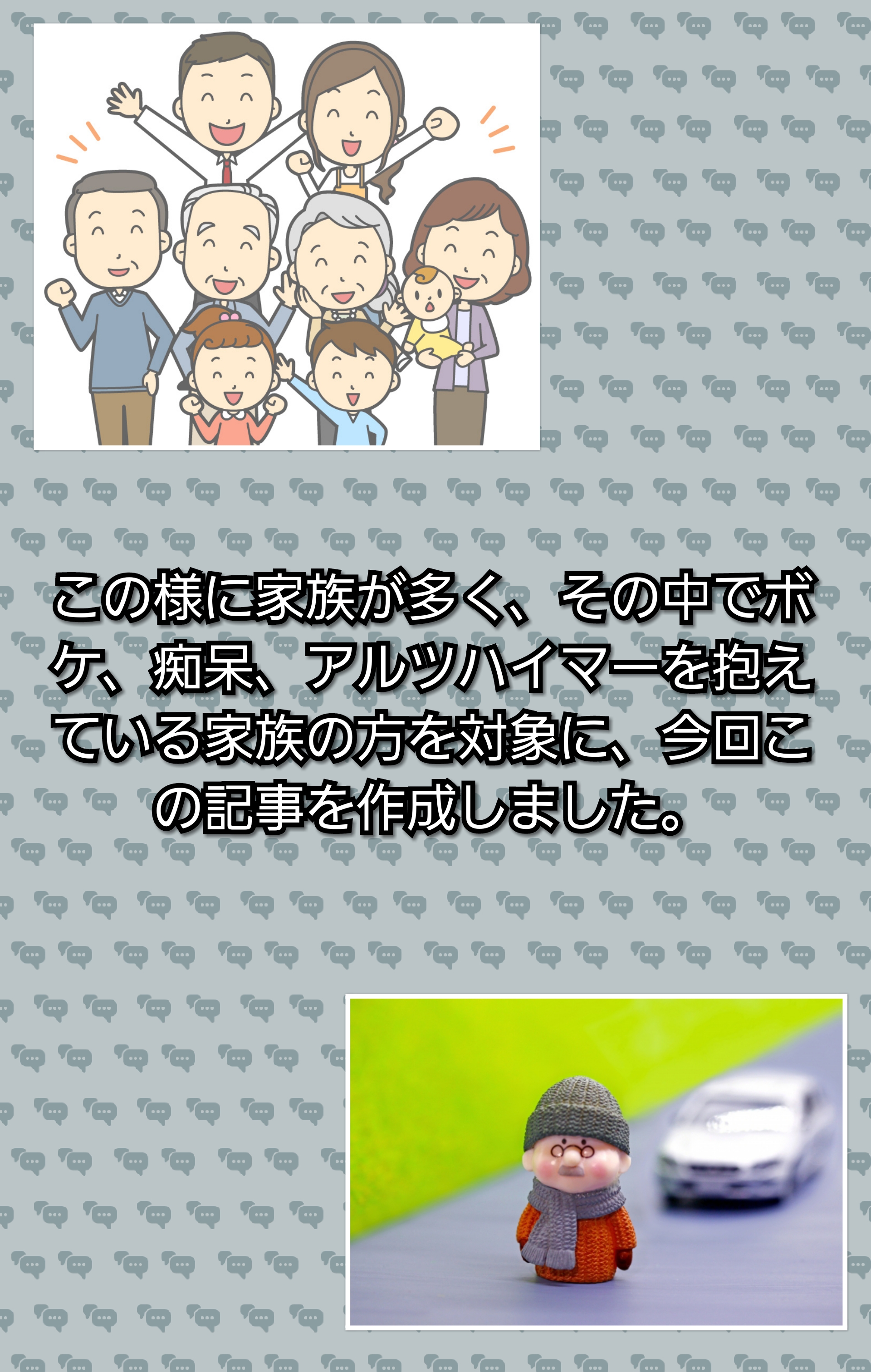 ボケ、痴呆、アルツハイマーの病状を抱えている家族の方へ。
