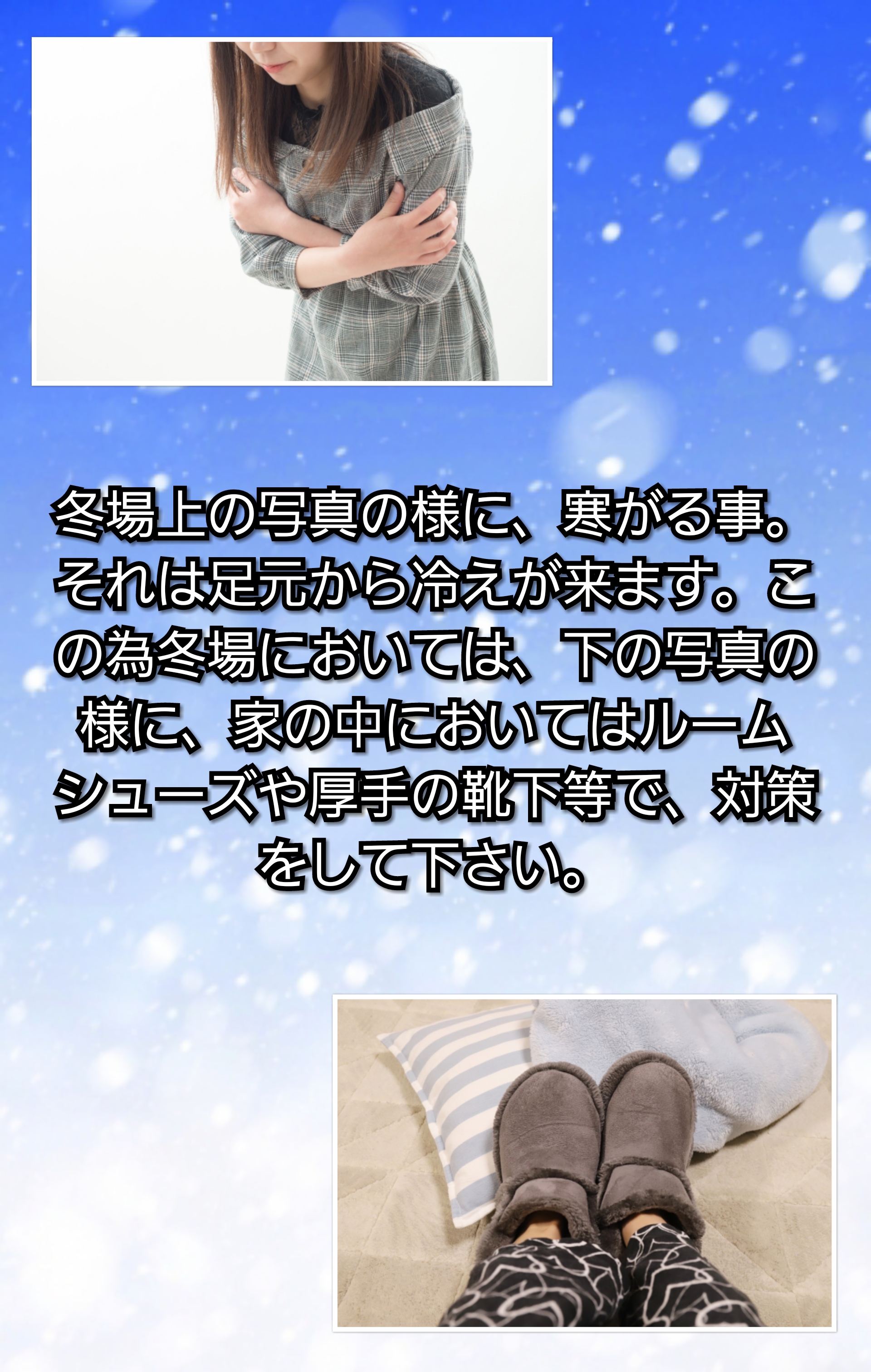 その上において冬場における体中の冷えは、足元から対策をして下さい。