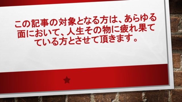 人生その物に疲れ果てた方々にこの記事でお伝え致します。