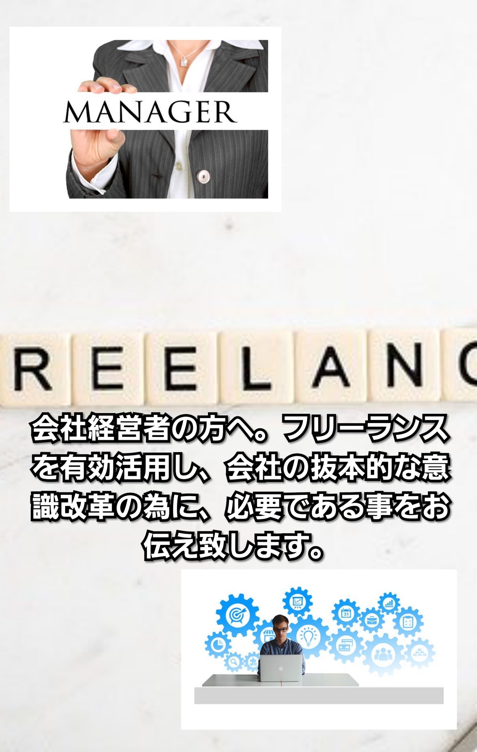改めまして優秀で、会社の抜本的な意識改革が出来るだけの力があるフリーランスを求める経営者の方へお伝え致します。