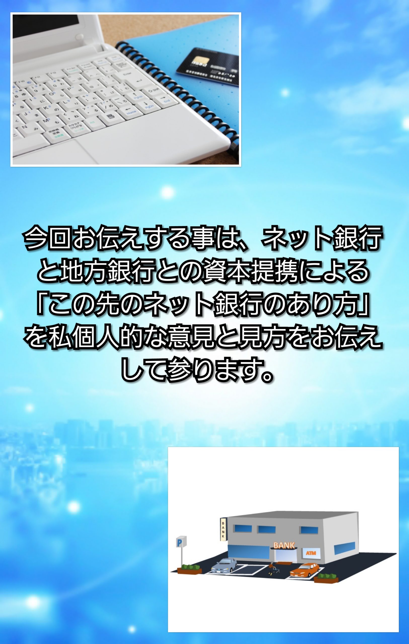 ここまで本文で、ネット銀行の事とそのネット銀行の今後の存在のしかたにつぃてお伝えして参りました。