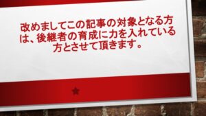 言ってしまえば、世代交代に伴う後継者の育成と言う事です。